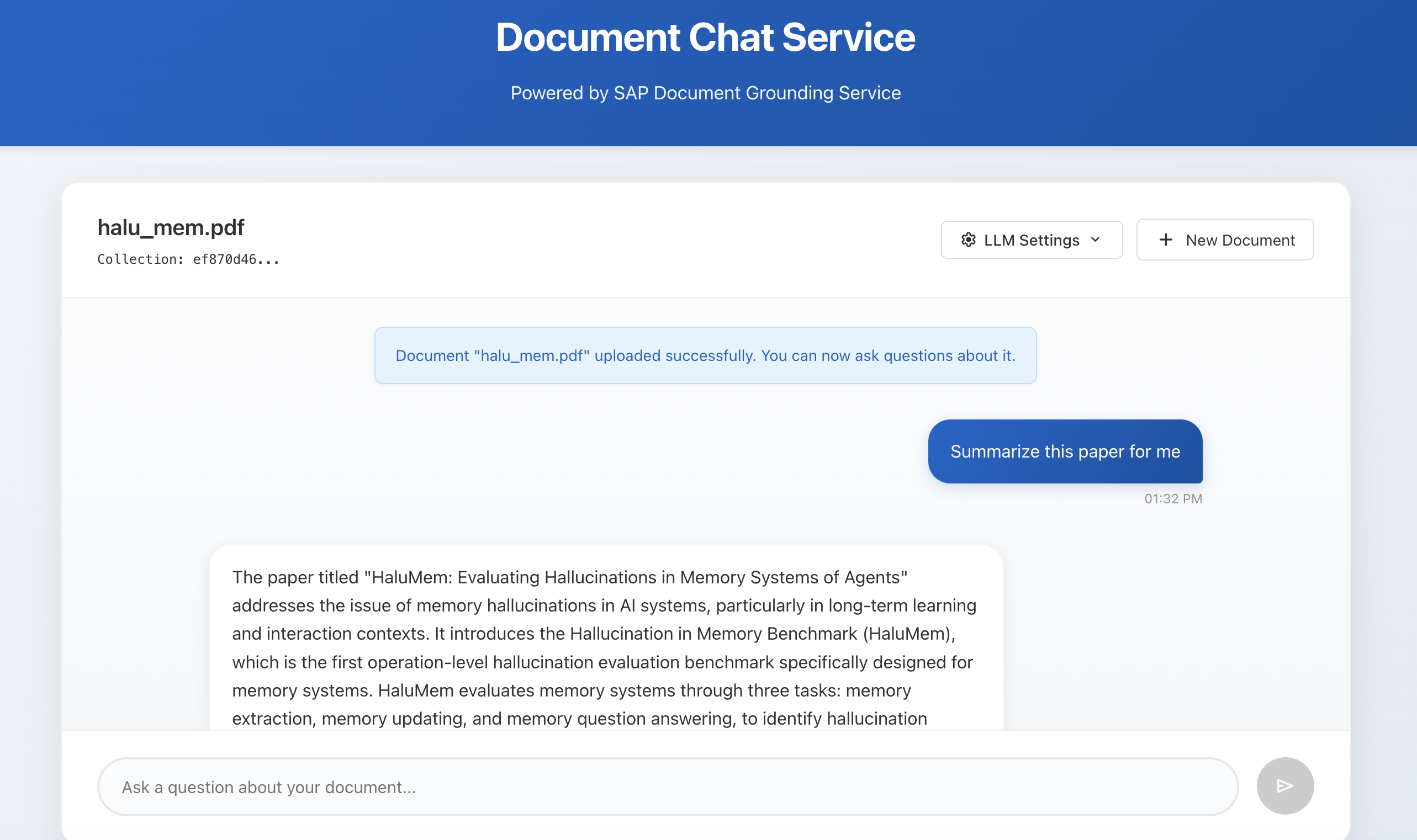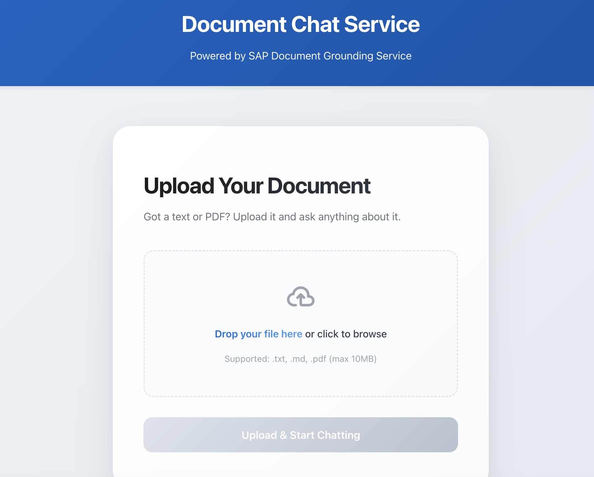 Google provides an interactive File Search demo to showcase their service. To demonstrate SAP's Document Grounding Service in action, I built a similar demo application: a Document Chat Service where you can upload PDFs or text files and ask questions about them.